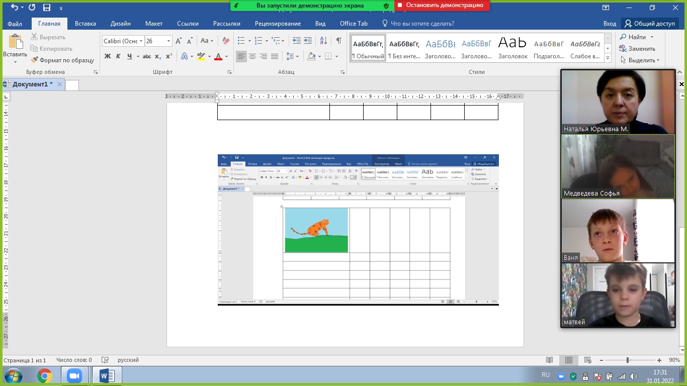 Занятия в Творческом объединении "Компьютер и Я" (педагог Наталья Юрьевна Минченкова) проходят в дистанционном формате на платформе zoom. Ребята вместе с педагогом знакомятся с новыми инструментами текстового процессора MS Word, учатся работать с таблицами и вставлять в документ изображения.